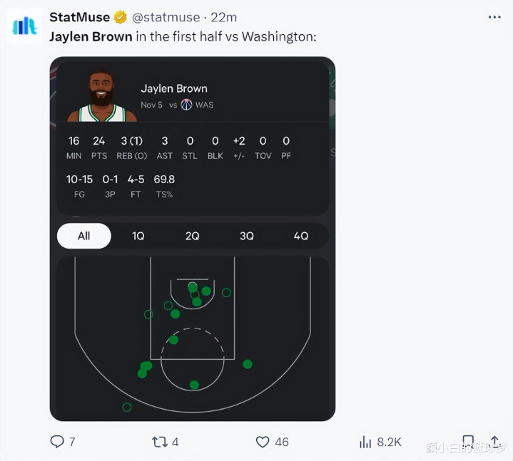 上半场布朗出战16分钟,15中10,罚球5中4,拿刀片24分3篮板3助攻,命中率66.7%,真实命中率69.8%,他就是绿凯大比分领先奇才的关键人物。