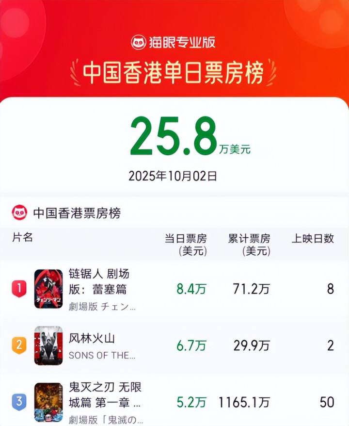 据国内的电影平台显示,《风林火山》在中国香港两天时间,仅收获了不到30万美元票房,换算成人民币差不多是300万。都不如已经上映有一周多的日本动画电影《链锯人 剧场版》,如此不得不说,香港电影已经被抛弃了,且不仅仅只是被中国内地所抛弃。